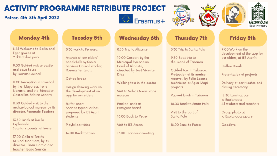 Del 4 al 8 de abril tendrá lugar en Petrer la primera movilidad del proyecto Erasmus+ rEtribUte, desarrollado por el IES Azorín y su socios Thomas-Mann Gymnasium de Berlín y Egri Pásztorvölgyi Altalános Iskola és Gimnázium de Eger (Hungría).