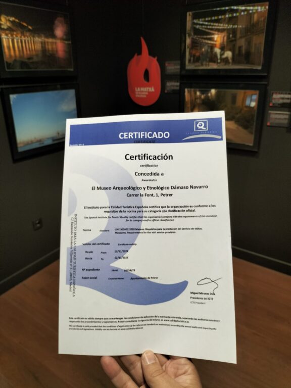 Desde que en el año 2020 el Instituto de Calidad Turística Española (ICTE) otorgase al Museo de Petrer el primer reconocimiento como organización que reúne los requisitos exigidos en la Norma “UNE 302002:2018: museos”, el Dámaso Navarro lo ha renovado anualmente tras pasar una auditoría externa que verifica que el servicio al visitante tiene la calidad exigida para contar con este reconocimiento centrado en la vertiente del turismo cultural.