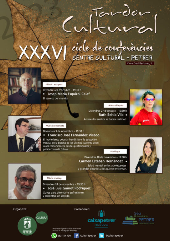 Fiel a sus 35 años de historia, el ciclo de conferencias “Otoño Cultural” vuelve a la palestra con una selección de ponentes de primer nivel en campos muy diferentes y dispares. Dos denominadores en común tienen todos ellos: el primero que “su elección es fruto del consenso y la aportación de candidatos que formulan los propios colectivos del Consell de Cultura”, ha destacado el concejal de Cultura, Fernando Portillo, y la segunda que “son personas con una reconocida trayectoria en sus respectivos campos que van a ofrecer una conferencia de primer nivel”. Durante las más de tres décadas que este ciclo lleva en marcha son más de 400 ponentes los que han  pasado por Petrer, lo que supone “un magnífico patrimonio que atesoramos en nuestra ciudad de compromiso por la Cultura y por ofrecer conferencias de ámbitos muy distintos”.