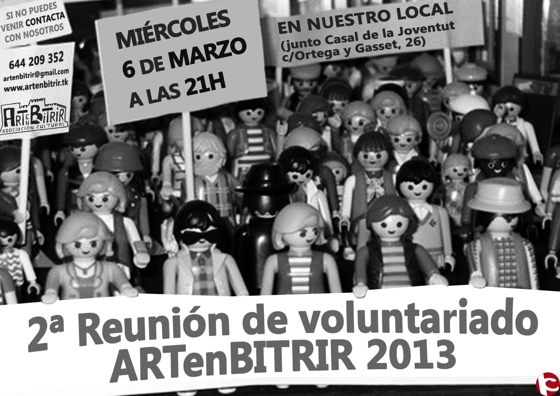 El próximo miércoles, 6 de Marzo a las 9 de la noche se ha convocado la 2º Reunión de Voluntariado para organizar «ARTenBITRIR 2013» 2º Encuentro de Nacional de Artistas de Calle en el local de la asociación (C/Ortega y Gasset, 26). En esta reunión se informará de las próximas actividades: Concierto de Pep el Botifarra a beneficio de ARTenBITRIR 2013, Gran Gala Presentación de ARTenBITRIR 2013, se hará el reparto de carteles para divulgar los actos y se solicitará voluntarios/as para estar en la mesas de información y venta de material de propaganda.