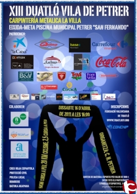 Este sábado 16 de abril a partir de las 16.00 se llevará a cabo el XIII Duatlón “Villa de Petrer” con una distancia sprint de 5 km. de carrera a pie, 20 km. de ciclismo y otros 2.5 km. de carrera a pie. La nota más relevante es el cambio de itinerario que se va a producir ya que el circuito de carrera a pie se traslada de la zona de El Campet, donde se hacía imposible la retirada de vehículos por el importante crecimiento demográfico experimentado en este barrio, hasta los aledaños de la Ciudad Deportiva San Fernando, junto a la sede del C.N. Petrer-La Villa, donde estarán ubicadas tanto la salida como la meta.