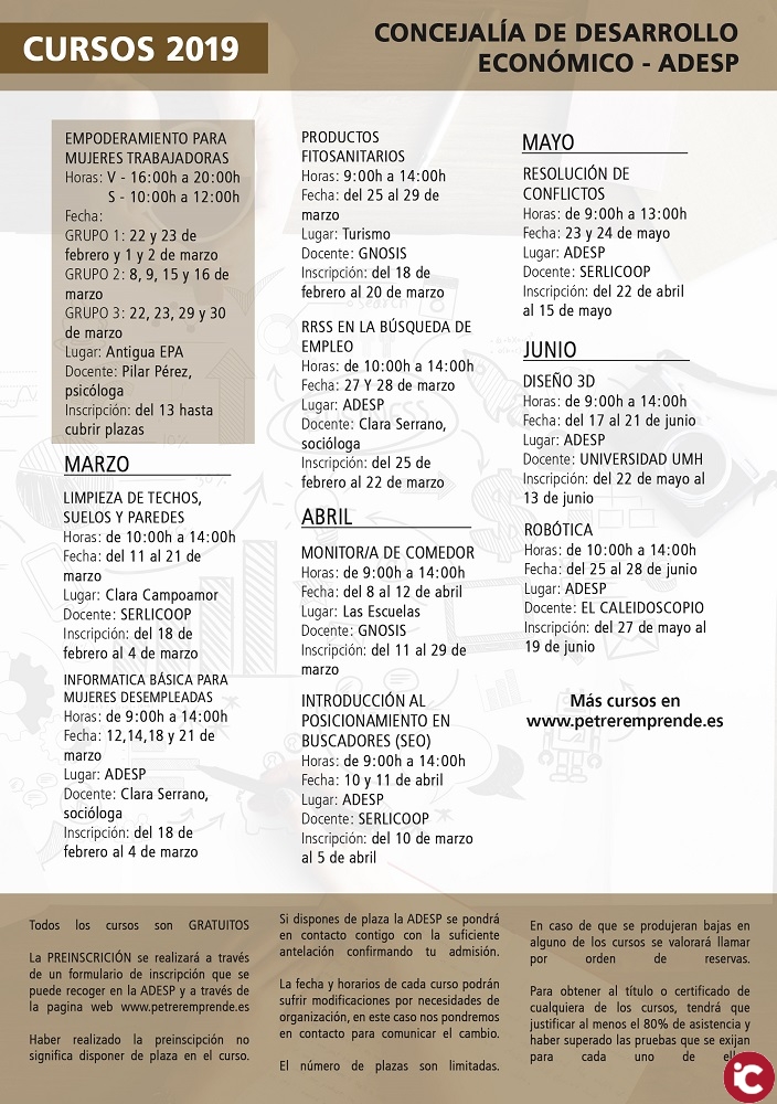 Las inscripiciones deben realizarse on-line a través de la web www.petreremprende.es, aunque también se podrán hacer de manera presencial a través de la concejalía ubicada en la calle Luis Chorro, 6.