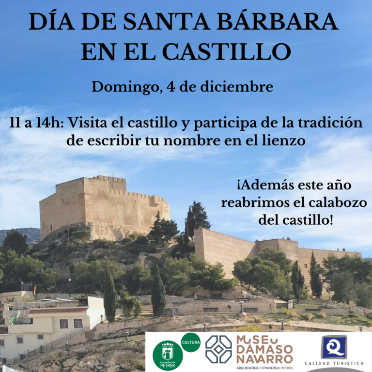PATRIMONIO – MUSEO Petrer. 1 de diciembre de 2022 Para poder cumplir con la tradición de subir al punto más alto de Petrer por Santa Bárbara, este domingo, 4 de diciembre, la concejalía de Patrimonio abrirá el Castillo-fortaleza de 11 a 14 horas. Una costumbre que se remonta, al menos, a principios del siglo XX.