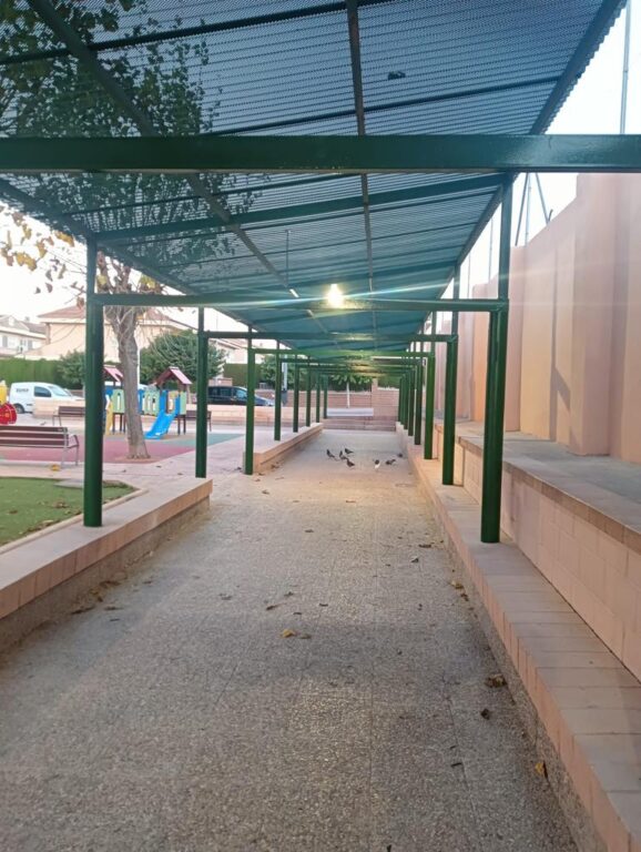 La actuación ha consistido en la reparación y supresión de algunas zonas de pérgola y la mejora del equipamiento urbano del parque