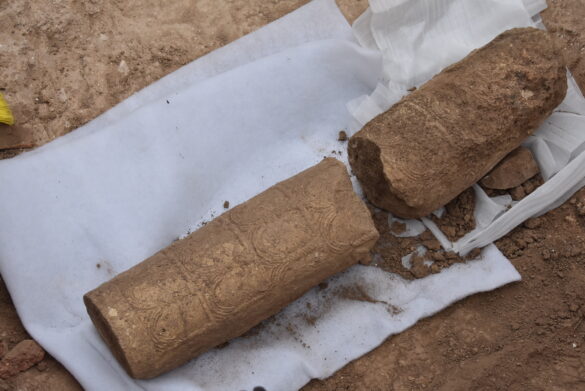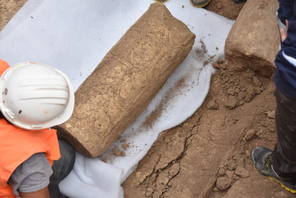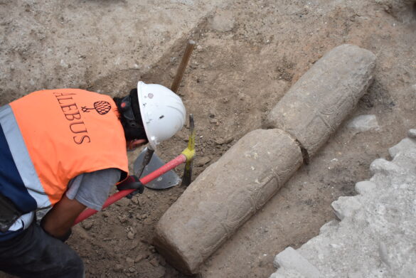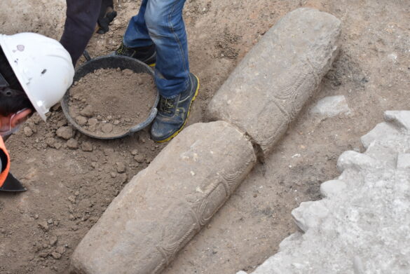 Si hace un par de semanas se documentó la existencia de parte de un mosaico con decoración vegetal y de color bícromo (blanco y negro), datado entre los siglos III y principios del IV después de Cristo, a falta de confirmar el estudio de los restos arqueológicos, ahora sorprende la aparición de parte de una columna que está partida en dos partes, de 1,40 m de altura y unos 30 cm de diámetro en total y del que destaca una decoración arquitectónica, basada en una seriación de columnas y arcos de medio punto. Teniendo en cuenta el relleno en el que se encontró, a priori, la columna se data en época bajoimperial (siglo IV -V d. C.), a la espera de obtener datos más concretos.
