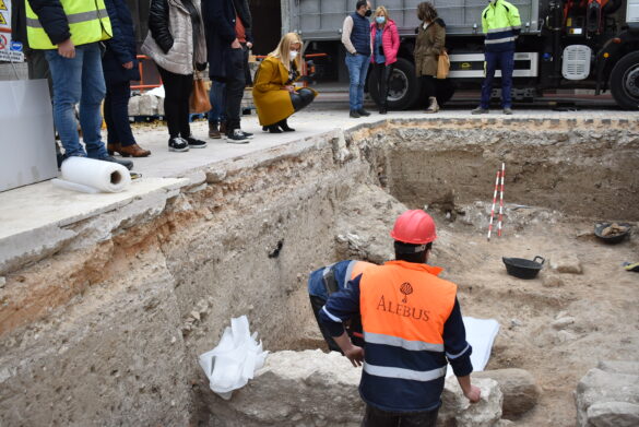 La alcaldesa de Petrer, Irene Navarro, el concejal de Cultura, Fernando Portillo, el director del Museo Dámaso Navarro, Fernando Tendero y varios concejales del equipo de gobierno del Ayuntamiento de Petrer han estado en todo momento siguiendo la evolución de la extracción de la columna por lo excepcional del hallazgo.
