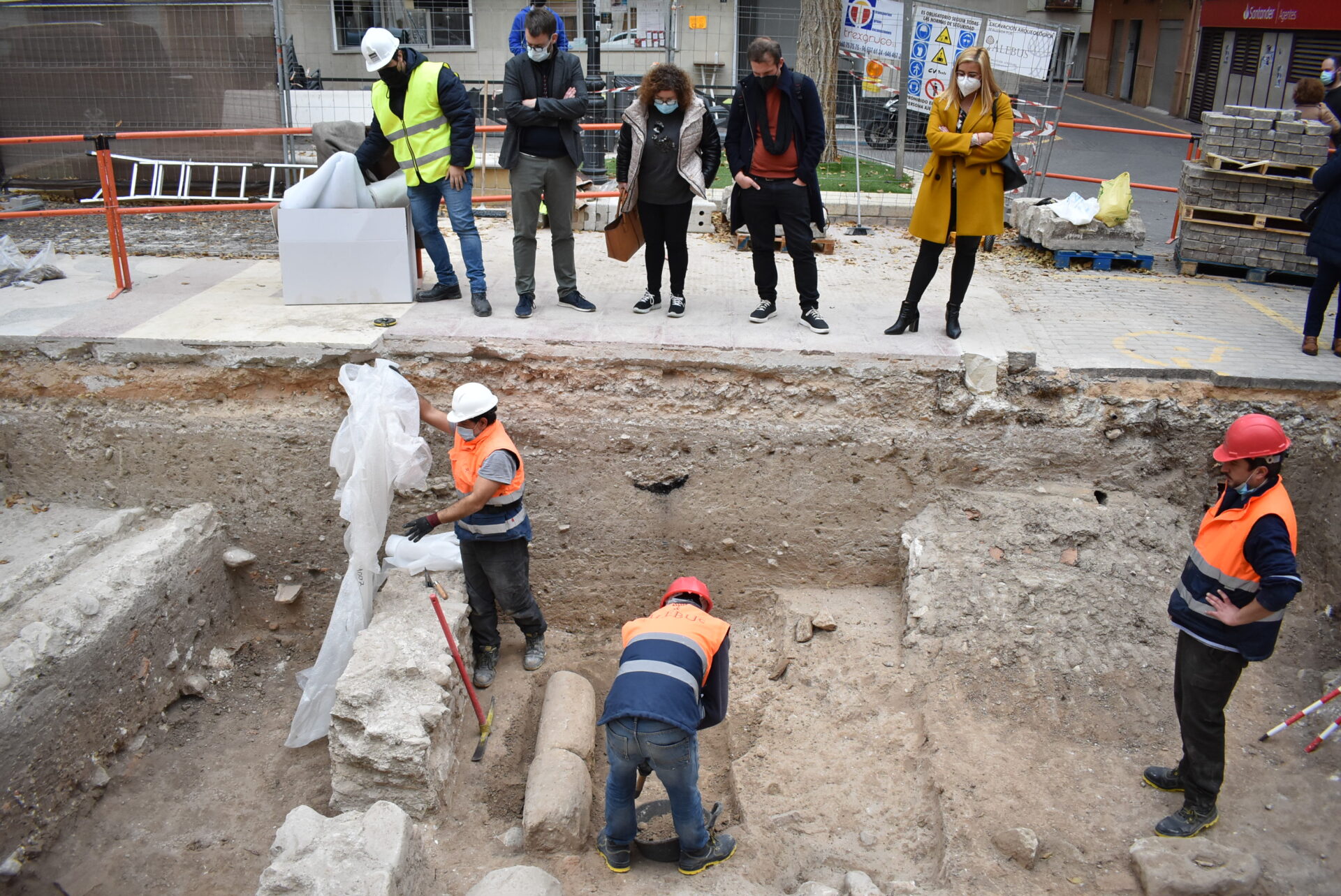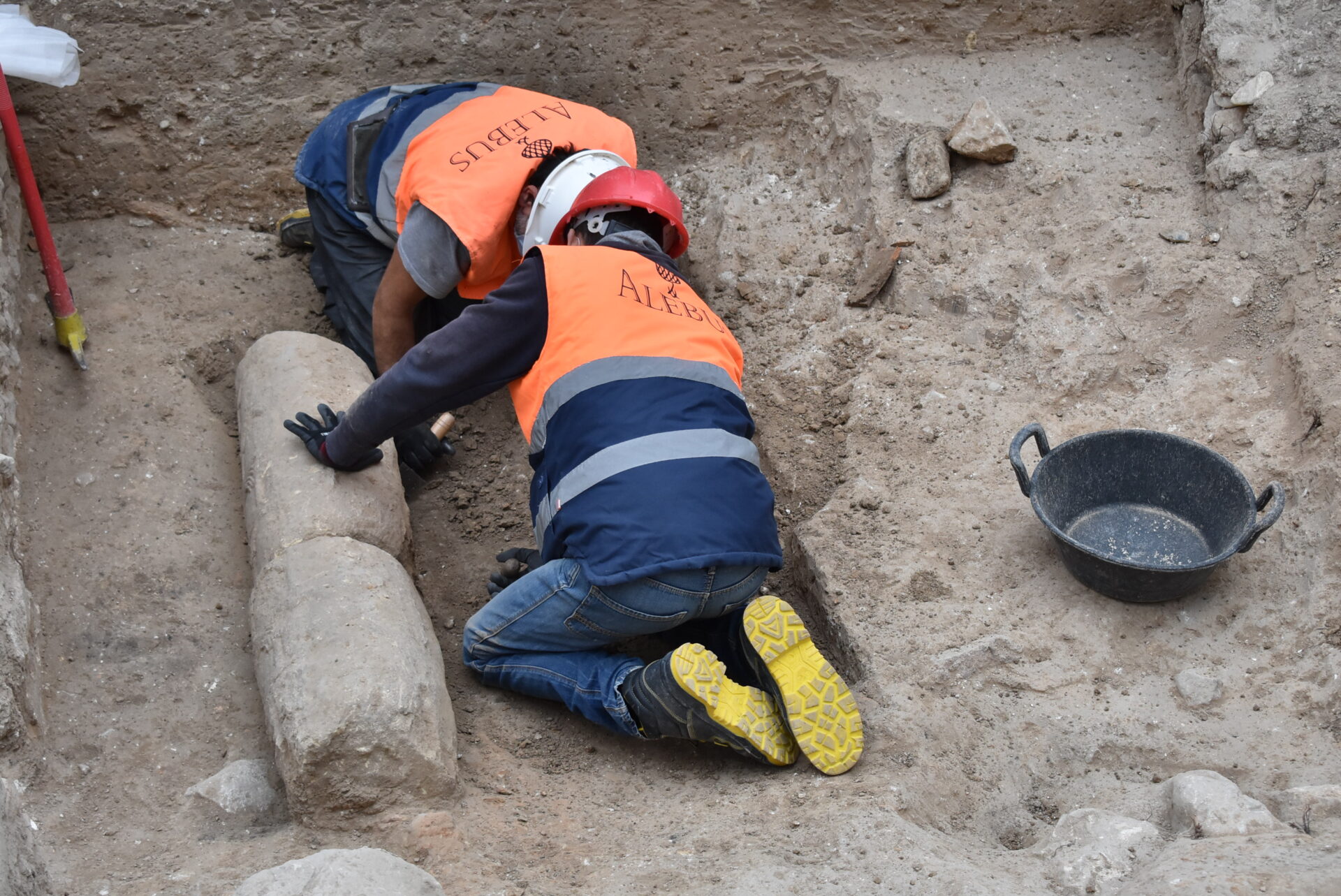 Si hace un par de semanas se documentó la existencia de parte de un mosaico con decoración vegetal y de color bícromo (blanco y negro), datado entre los siglos III y principios del IV después de Cristo, a falta de confirmar el estudio de los restos arqueológicos, ahora sorprende la aparición de parte de una columna que está partida en dos partes, de 1,40 m de altura y unos 30 cm de diámetro en total y del que destaca una decoración arquitectónica, basada en una seriación de columnas y arcos de medio punto. Teniendo en cuenta el relleno en el que se encontró, a priori, la columna se data en época bajoimperial (siglo IV -V d. C.), a la espera de obtener datos más concretos.