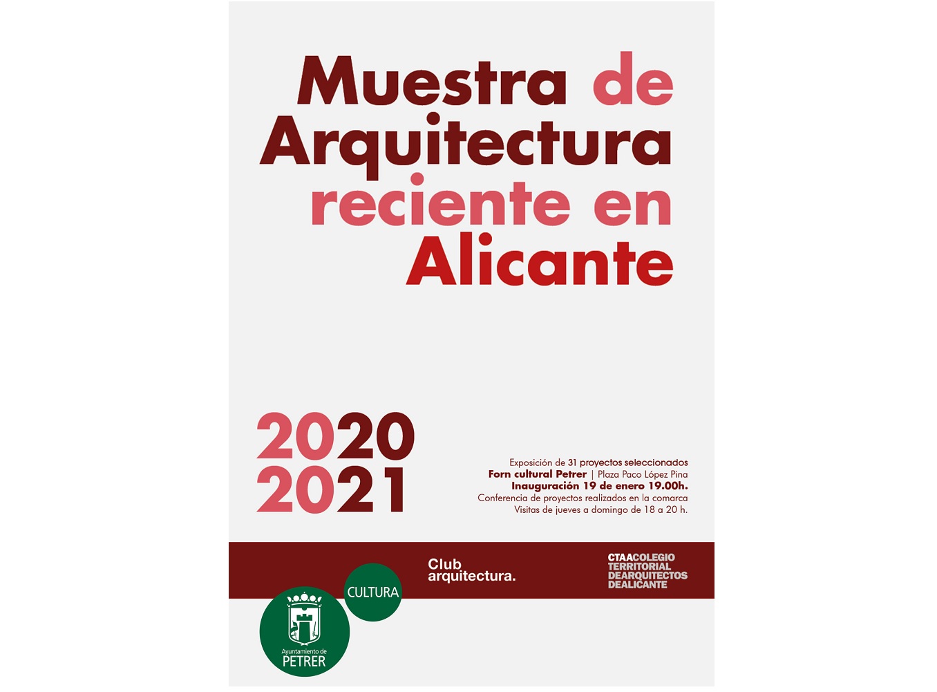 El próximo jueves 19 de enero de 2023 se inaugura la Muestra de Arquitectura Reciente de Alicante 2020 2021 que recopila los 32 proyectos seleccionados por un jurado formado por: Enrique Abad Monllor, Jefe del Departamento de Cultura del CTAA, Javier Esteban Garballo, Arquitecto, Prof. De proyectos arquitectónicos de la Escuela de Arquitectura de Zaragoza, Enrique Fernéndez –Vivancos González, Arquitecto, Paula Franco Sanchez, Vocal de Cultura del CTAA y Javier García Solera Vera, arquitecto propuesto por los participantes.
