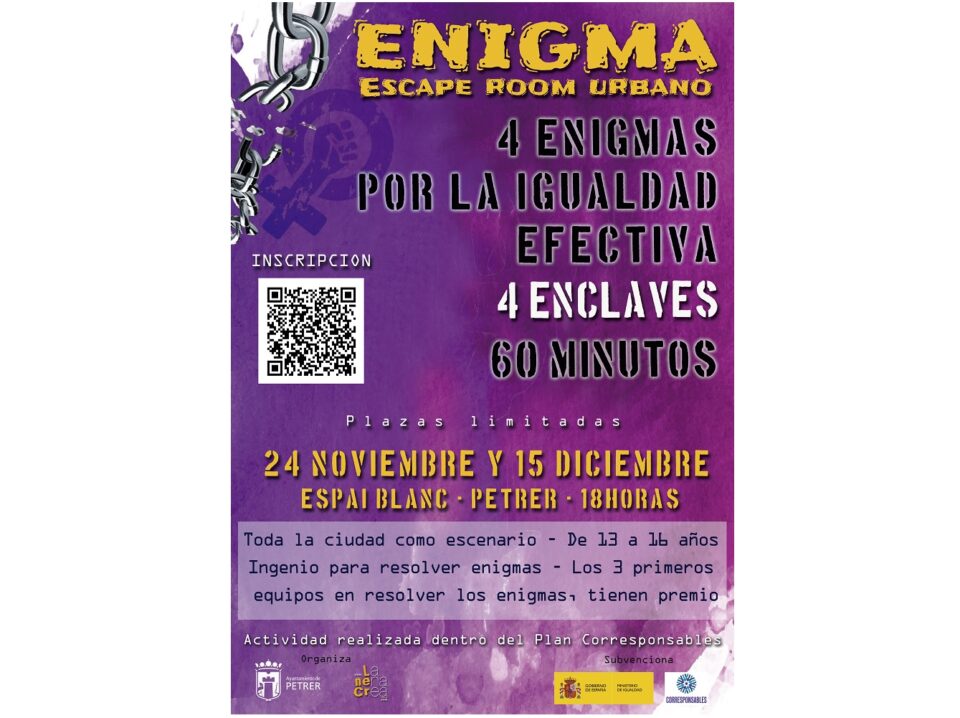 Se trata de un Escape Room urbano que, bajo el título “Enigma”, reta a los participantes a resolver 4 enigmas por la igualdad efectiva. Una actividad dirigida a jóvenes de 13 a 16 años que participarán en un juego en vivo por las calles de Petrer con misterio, cultura, ingenio…, ingredientes para una gran aventura. A través de personajes y visitando cuatro enclaves diferentes de Petrer, tendrán que guiarse por las pistas indicadas a través de códigos QR para ir resolviendo los diferentes enigmas planteados.