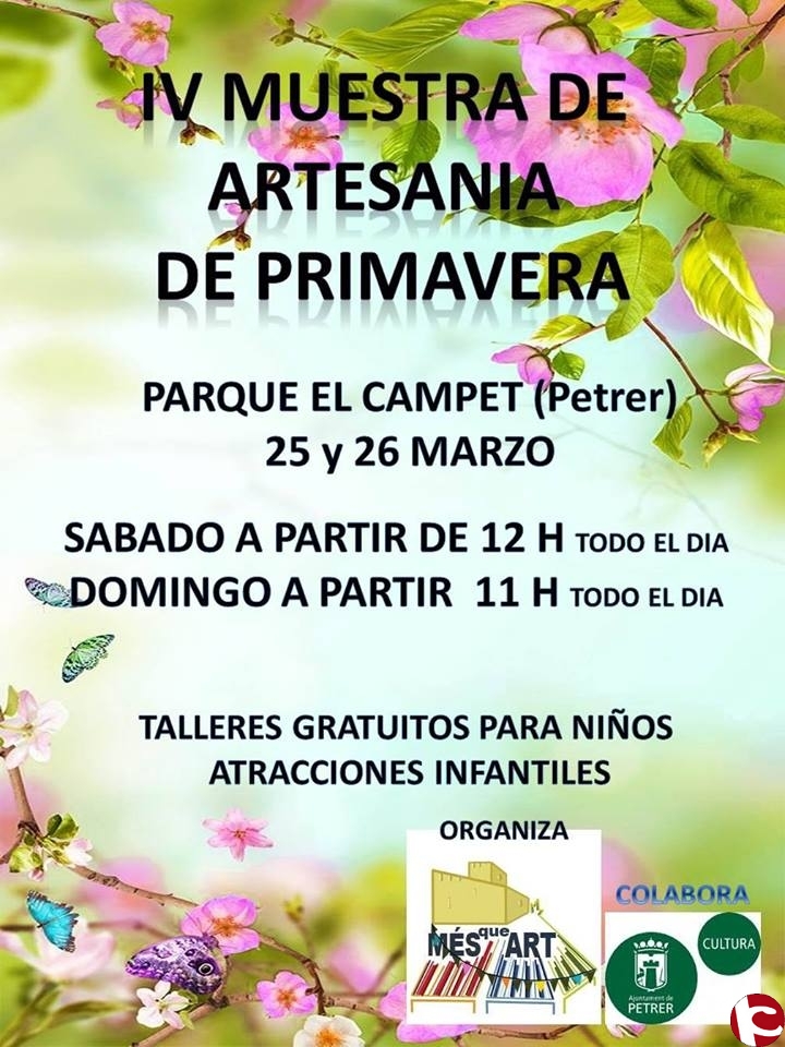 Este fin de semana llega, una vés más la muestra de artesanía de primavera con más de 20 puestos de productos realizados a mano por nuestros artesanos. Gran variedad de trabajos realizados con cuero,telas,papel,madera,goma eva, lana, pinturas, y muchas cosas más.