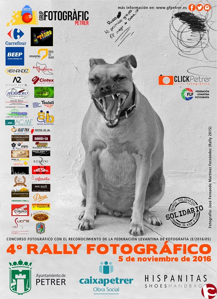 Un año más, y van 4, el Rally Fotográfico será la actividad estrella del ClickPetrer Otoño Fotográfico que organiza el Grup Fotogràfic de Petrer (GFP). El Rally se celebrará el próximo sábado 5 de noviembre, desde la 7:00 h. de la mañana hasta las 19:00 h. de la tarde. El tema de concurso, para todas las categorías, será La villa de Petrer en todos sus aspectos. Cada participante deberá entregar 3 fotografías sobre este tema, entre las horas arriba indicadas. Hay que recalcar que es el único Rally Fotográfico avalado por la Federación Levantina de Fotografía. El lugar para las inscripciones in situ así como la comida y la entrega de fotografías será en la Manzana Cultural (junto al Teatro Cervantes). Este año se entregan 12 premios, divididos en 3 categorías, según la edad de los participantes, quedando de la siguiente manera: