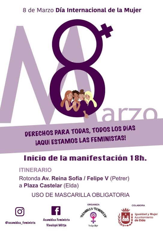 La Asamblea Feminista Vinalopó Mitjà ha organizado una manifestación con motivo del 8M, Día Internacional de la Mujer. El acto se realizará el martes, 8 de marzo, a las 18:00 horas, comenzará en la rotonda de la Av. Reina Sofía esquina Avda. Felipe V de Petrer y tendrá final en la Plaza Castelar de Elda.