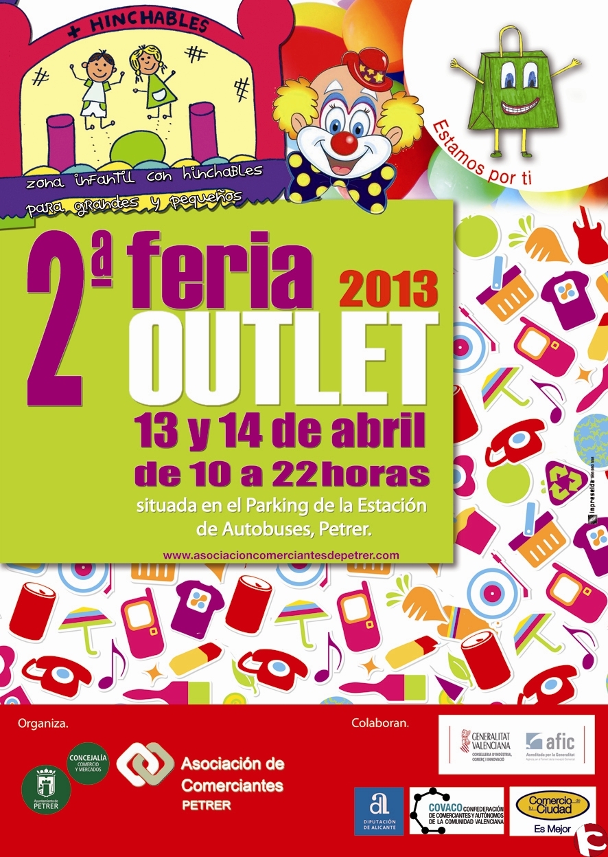 La Asociación Local de Comerciantes de Petrer junto con la Concejalía de Comercio ha organizado la II Feria Outlet del Comercio de Petrer. Tendrá lugar los próximos días 13 y 14 de abril en horario de 10 a 22 horas. La feria estará ubicada en el aparcamiento situado detrás de la estación de autobuses y en el lado izquierdo de la calle Poeta Enrique Amat.