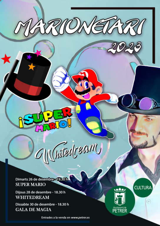 La programación se iniciará con el musical de Super Mario, a cargo de una compañía que ya ha estado en Petrer con otras obras y que ha decidido estrenar esta nueva producción en el Marionetari, el martes 26 de diciembre a las 19:30 horas. El jueves 28, a las 18:30 horas, el teatro será escenario de Whitedream, un innovador espectáculo de burbujas, que promete fascinar a los asistentes con su magia y belleza visual. Cerrando el ciclo, el sábado 30 a las 18:30 horas, se presentará una Gala de Magia, en la que intervendrán varios magos y que está dirigida tanto a niños como a adultos.
