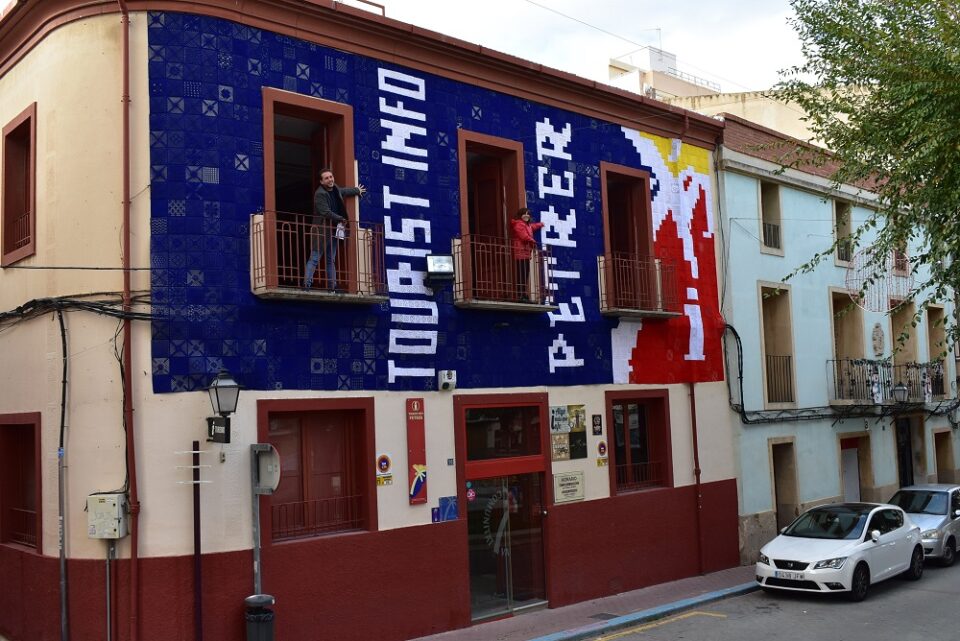 Esta mañana, la fachada de la Tourist Info de Petrer ha estrenado decoración de ganchillo, con el tapiz con más kilómetros de lana que se han tejido desde que se puso en marcha la iniciativa «Tejiendo Petrer», con 101 km.