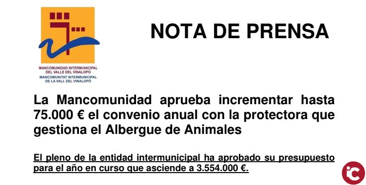 El pleno de la Mancomunidad Intermunicipal del Valle del Vinalopó ha aprobado hoy incrementar un 50% el convenio con la protectora que gestiona el Albergue de Animales, pasando de 50.000 € a 75.000 €. El objetivo, tal y como ha señalado la presidenta de la entidad y alcaldesa de Petrer, Irene Navarro, es recuperar progresivamente el presupuesto de 95.000 € con que contaba hace años este servicio que “es fundamental para los cuatro municipios ya que se encarga de la recogida y el bienestar de los animales abandonados”.