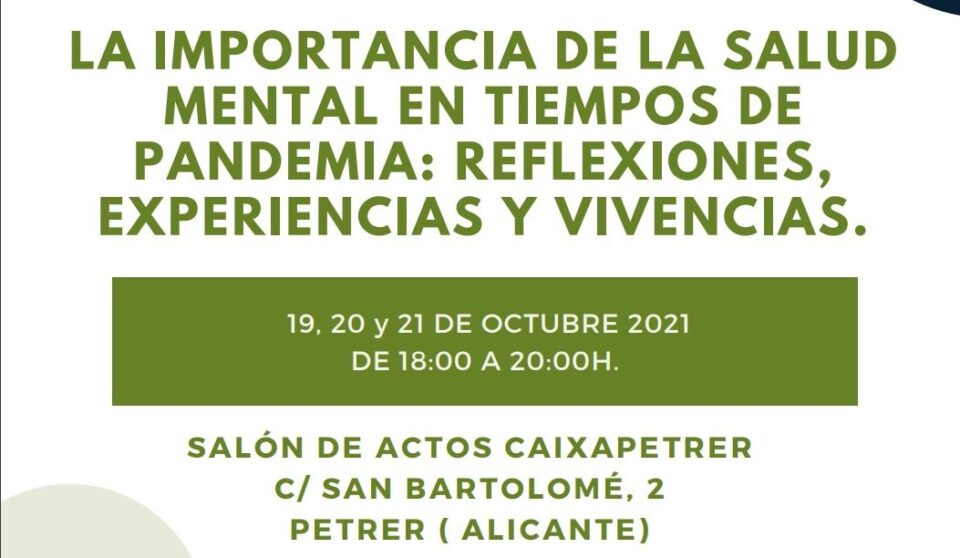 Para ello, con la colaboración de CaixaPetrer, organizamos el evento LA IMPORTANCIA DE LA SALUD MENTAL EN TIEMPOS DE PANDEMIA: REFLEXIONES, EXPERIENCIAS Y VIVENCIAS.