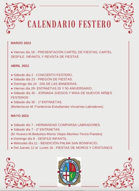 En la tarde de hoy, la Unión de Festejos de San Bonifacio ha hecho público el calendario de actos de las Fiestas de Moros y Cristianos de Petrer. Dichos actos comenzarán en marzo, en concreto el viernes 18 con la presentación de los carteles de Fiestas y del Desfile Infantil así como la Revista de Fiestas.