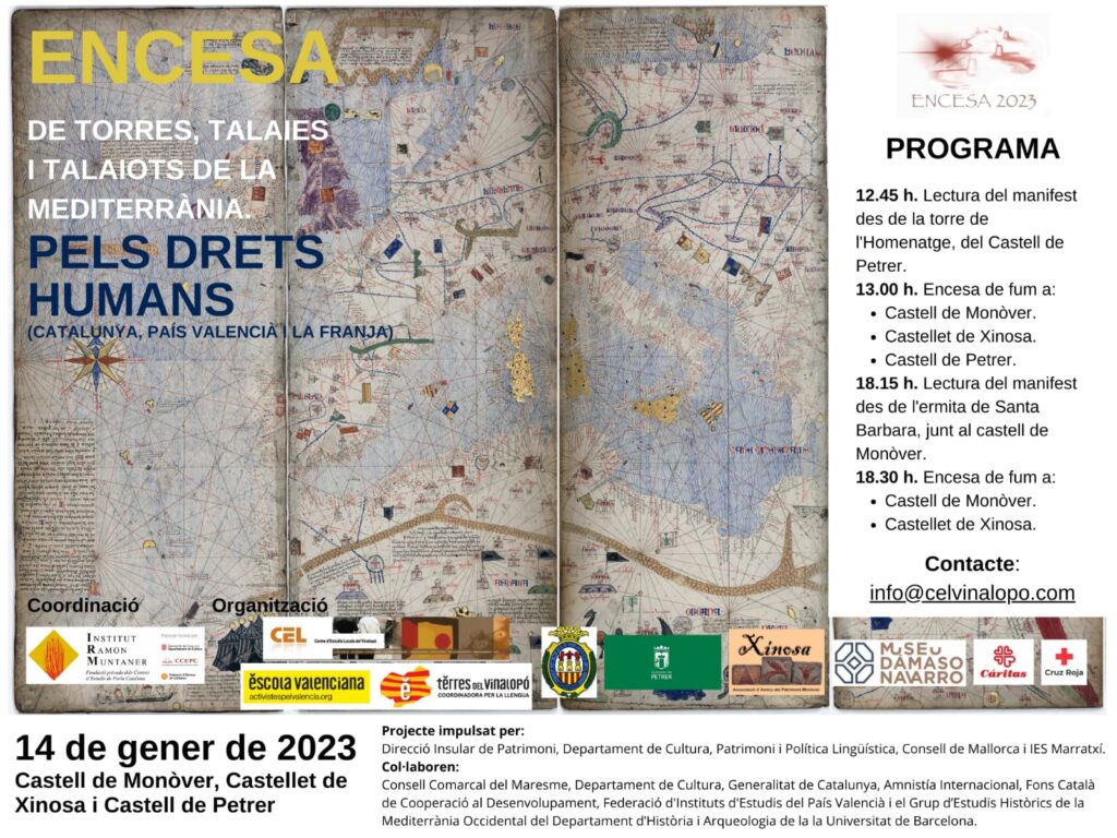 Este encendido de Torres y Atalayas del Mediterráneo por los derechos humanos es una iniciativa del Consell de Mallorca, el IES Marratxí y Amnistía Internacional, y celebrada por primera vez el 2016. El objetivo del acto es doble: por un lado, sensibilizar la población sobre la situación que vive el Mediterráneo, donde muchas personas que se ven obligadas a abandonar casa suya pierden la vida, tal como denuncia el manifiesto escrito por Amnistía Internacional, y, por otro lado, reivindicar y valorar las torres, atalayas, y fortificaciones como patrimonio histórico y cultural presente en estos territorios, ha destacado Fran Palomares, presidente del Centre d’Estudis Locals del Vinalopó, entidad que ha coordinado esta actividad y sobre la que ha indicado que “este año se ha sumado Petrer y Monóvar porque hemos tenido muy poco tiempo para organizarlo, pero en próximas ediciones queremos que se vayan sumando otras fortalezas de las poblaciones vecinas”.