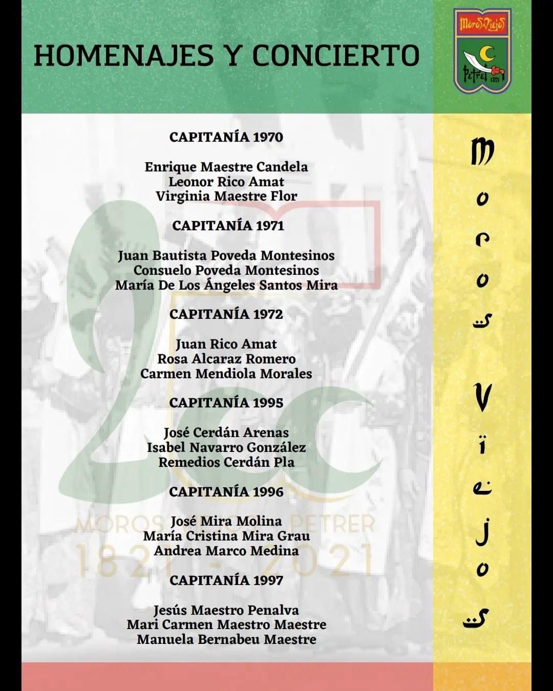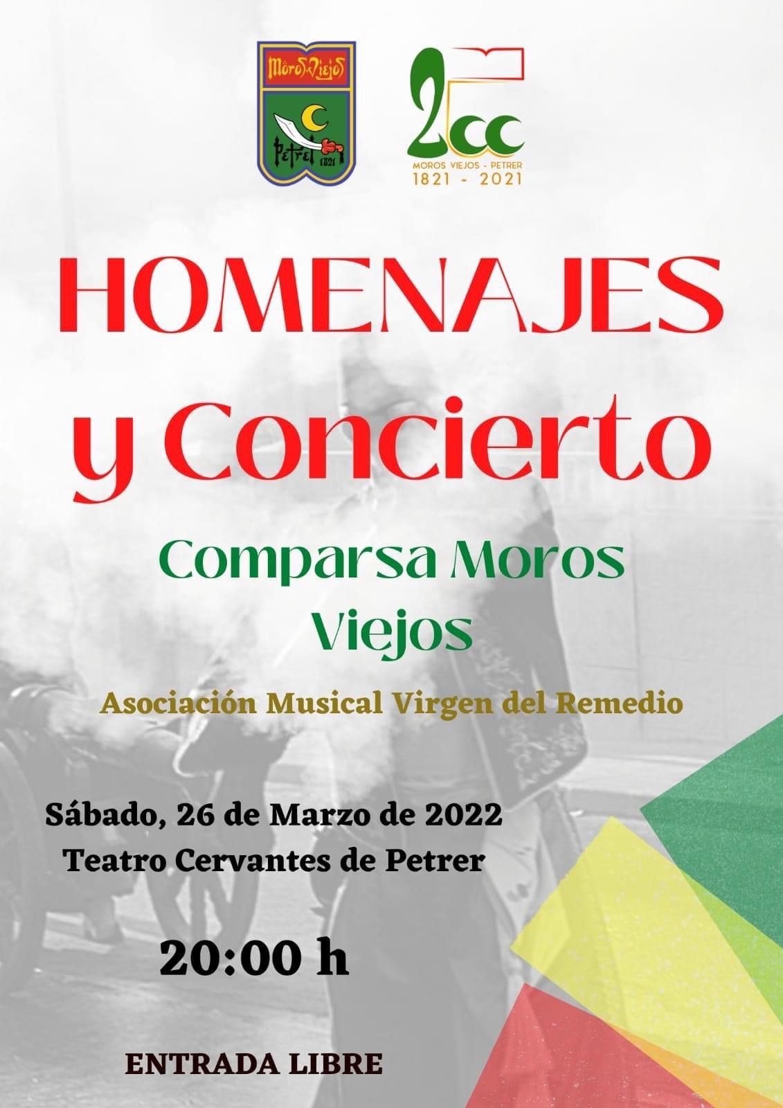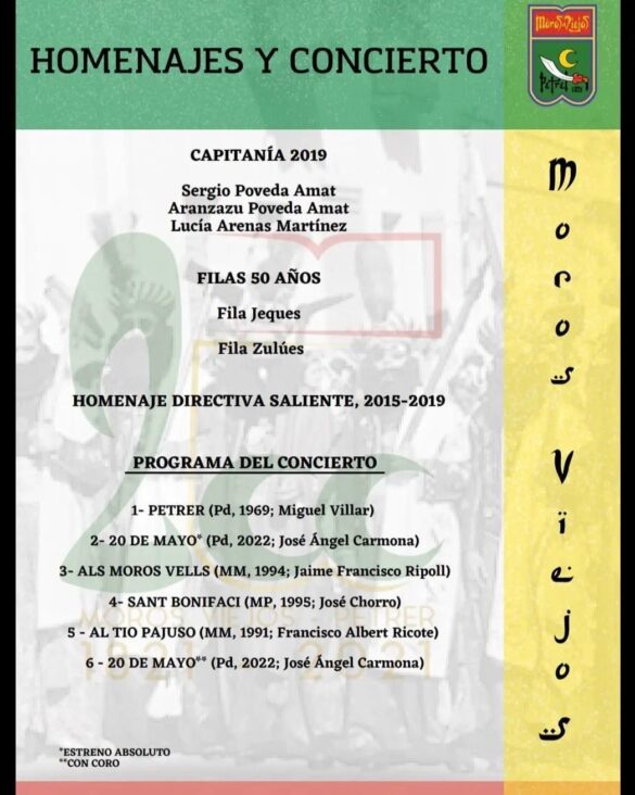 El Teatro Cervantes de Petrer será el escenario para que la Comparsa de Moros Viejos de Petrer lleve a cabo su concierto homenaje a capitanías y filas que celebraron su aniversario durante los años 2020 y 2021, y las del presente 2022.