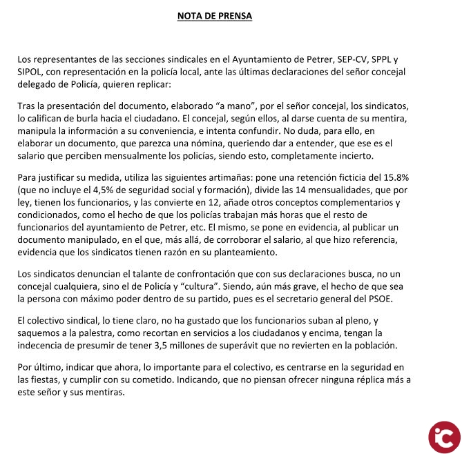 Para justificar su medida, utiliza las siguientes artimañas: pone una retención ficticia del 15.8% (que no incluye el 4,5% de seguridad social y formación), divide las 14 mensualidades, que por ley, tienen los funcionarios, y las convierte en 12, añade otros conceptos complementarios y condicionados, como el hecho de que los policías trabajan más horas que el resto de funcionarios del ayuntamiento de Petrer, etc. El mismo, se pone en evidencia, al publicar un documento manipulado, en el que, más allá, de corroborar el salario, al que hizo referencia, evidencia que los sindicatos tienen razón en su planteamiento.