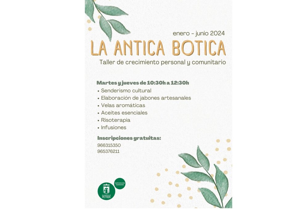 Bajo el título de “La Antica Botica”, el taller pretende ser un espacio para reforzar la solidaridad y la convivencia de usuarios y usuarias habituales del centro municipal, así como de aquellos vecinos interesados en la actividad. Para ello, de enero a junio, se van a desarrollar diferentes actividades de crecimiento personal como aromaterapia, con la realización de aceites esenciales; velas aromáticas; senderismo cultural, plantaciones ecológicas; risoterapia y autoconocimiento.