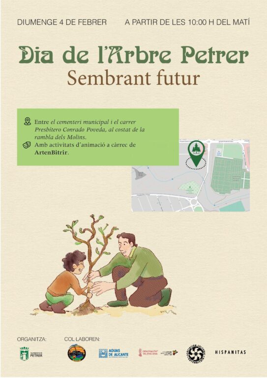 El próximo domingo 4 de febrero, a partir de las 10.00 de la mañana, la concejalía de Medio Ambiente ha organizado su tradicional celebración del Día del árbol, una actividad con más de 40 años de historia en la que colaboran el Centro Excursionista de Petrer, Aguas de Alicante, el personal del Paisaje Protegido Sierra del Maigmó y Sierra del Sit, el equipo de educadores ambientales, la asociación cultural Artenbitrir y, como novedad, este año se suma la empresa local Hispanitas.