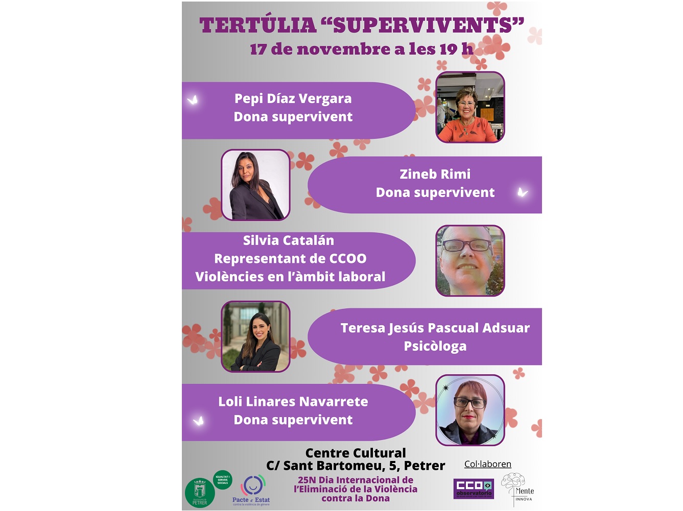 La concejalía de Igualdad y Servicios Sociales del Ayuntamiento de Petrer ha programado para este viernes 17 de noviembre una tertulia bajo el título de “SUPERVIVIENTES” en la que participarán varias mujeres que han sido víctimas de violencia de género y, tras salir de esa situación, quieren relatar sus casos para evitar que otras mujeres puedan sufrirla.
