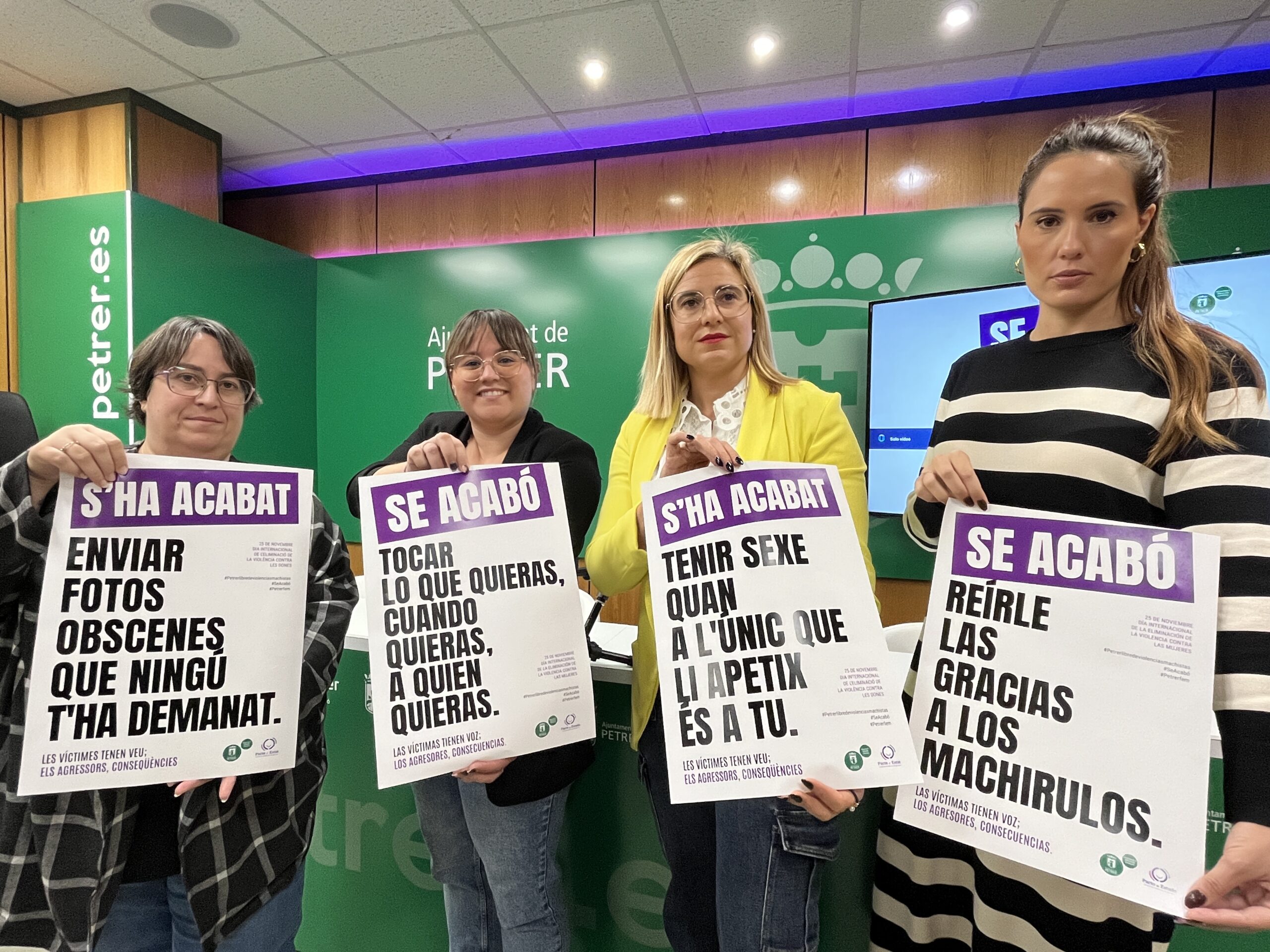 Esta mañana la alcaldesa de Petrer, Irene Navarro, acompañada de la concejala de Igualdad, Ana Tortosa, y de la agente y la promotora de Igualdad, Nuria Molina y Dolores Linares han presentado la campaña con la que, desde el Ayuntamiento de Petrer se pretende sensibilizar sobre la lucha contra la violencia contra las mujeres.
