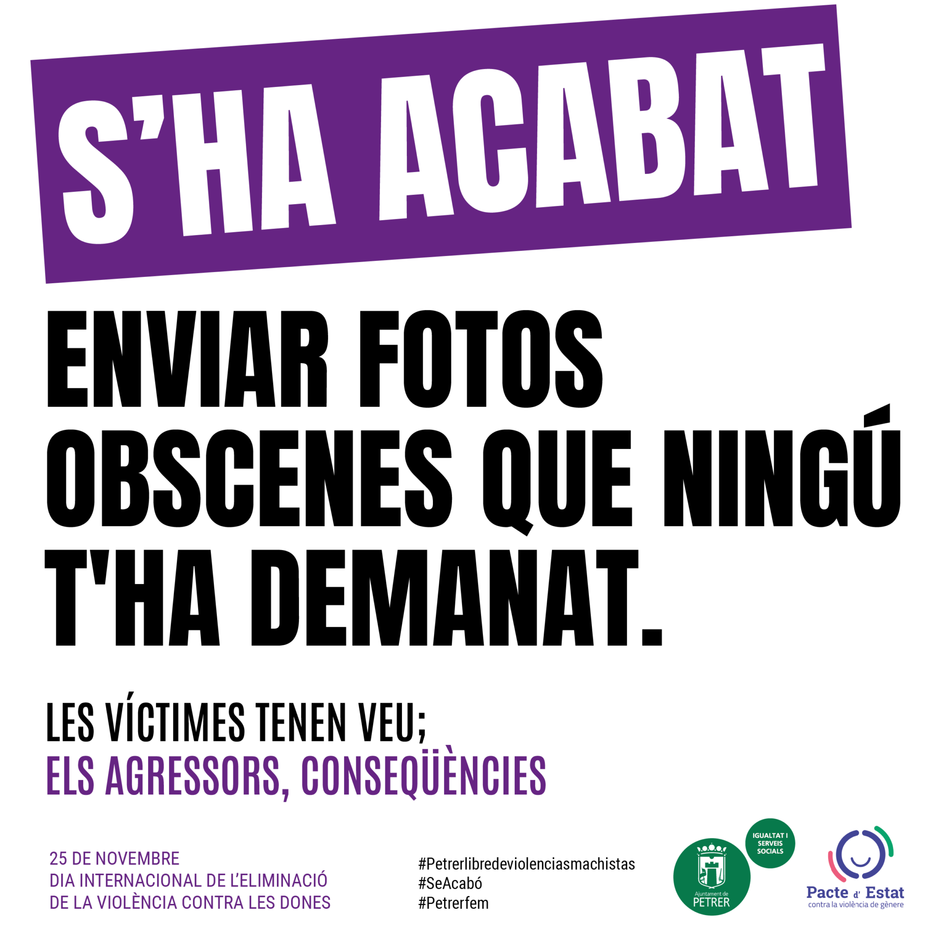 Tortosa ha dicho que el lema de la campaña es “Se acabó”, con cuatro submensajes que hacen referencia a esas conductas machistas normalizadas: “tocar lo que quieras, cuando quieras, a quien quieras”; “enviar fotos obscenas que nadie te ha pedido”; “reírle las gracias a los machirulos”; y “tener sexo cuando al único que le apetece es a ti”. Las piezas de la campaña se refuerzan con un mensaje general de cierre que reza “Las víctimas tiene voz, los agresores consecuencias”.