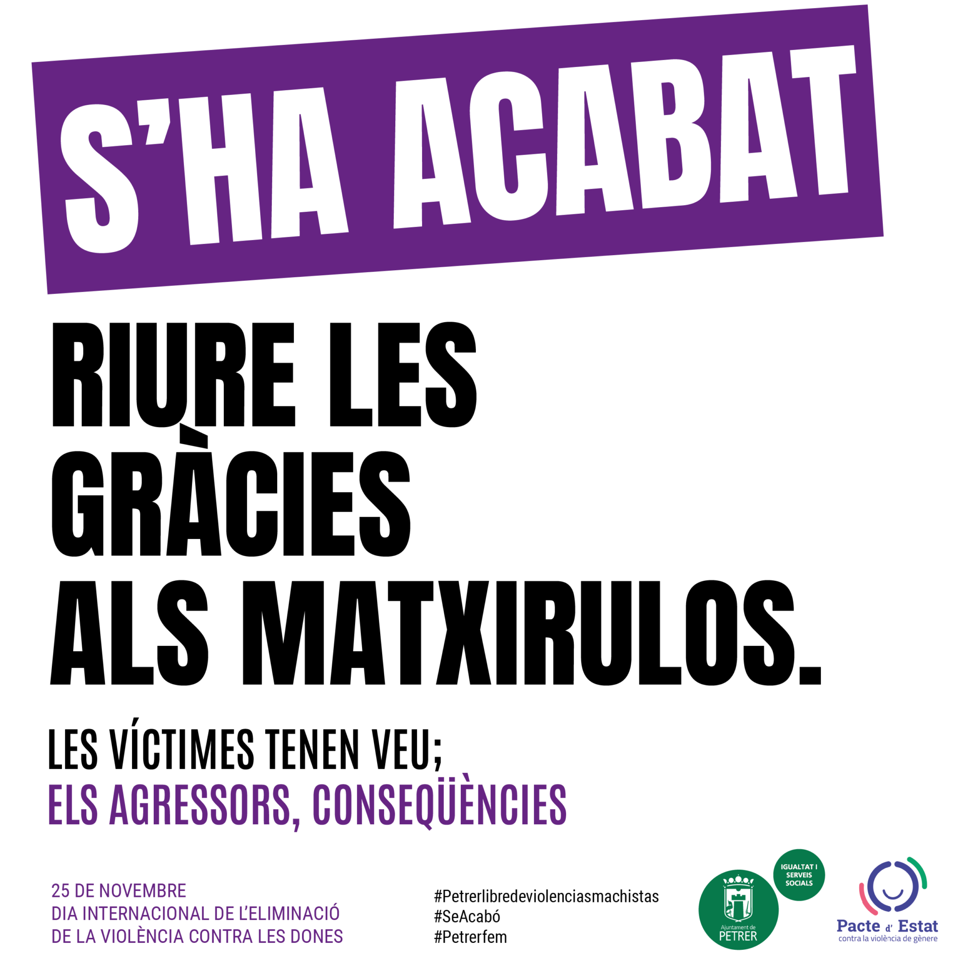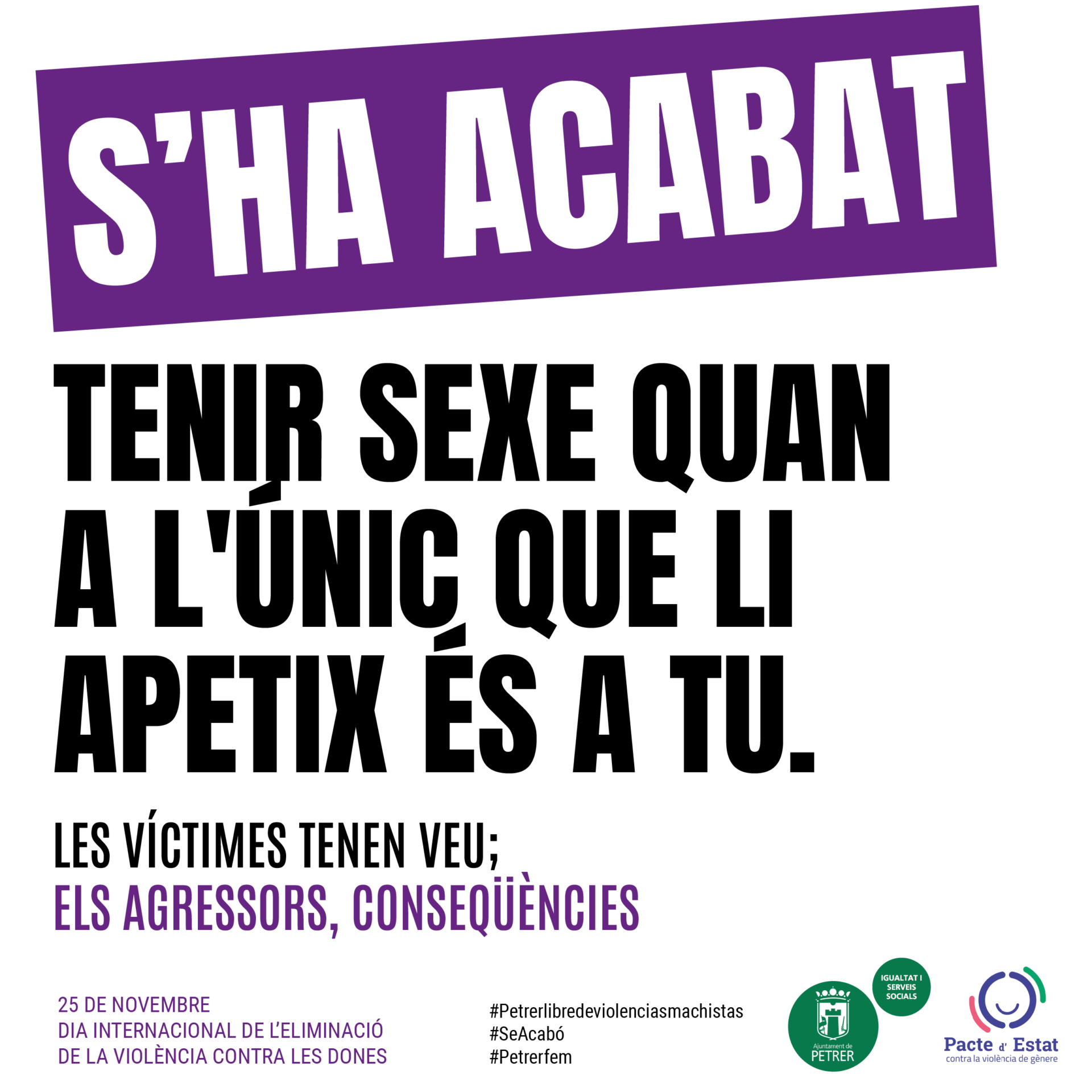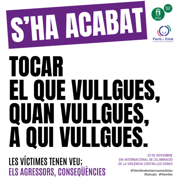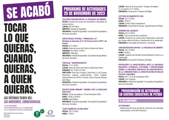 Una campaña que cada año pone en marcha la institución en torno al 25N, Día Internacional de la Eliminación de la Violencia contra las mujeres, como fecha clave de la sensibilización en torno a este tema, aunque, según ha indicado la alcaldesa, “es un trabajo que se hace durante todo el año con importantes labores de concienciación con la implicación de vecinas y vecinos de Petrer y la coordinación de la concejlaía con todos los centros educativos de la población” porque “es fundamental que se eduque en igualdad desde las edades más tempranas”.