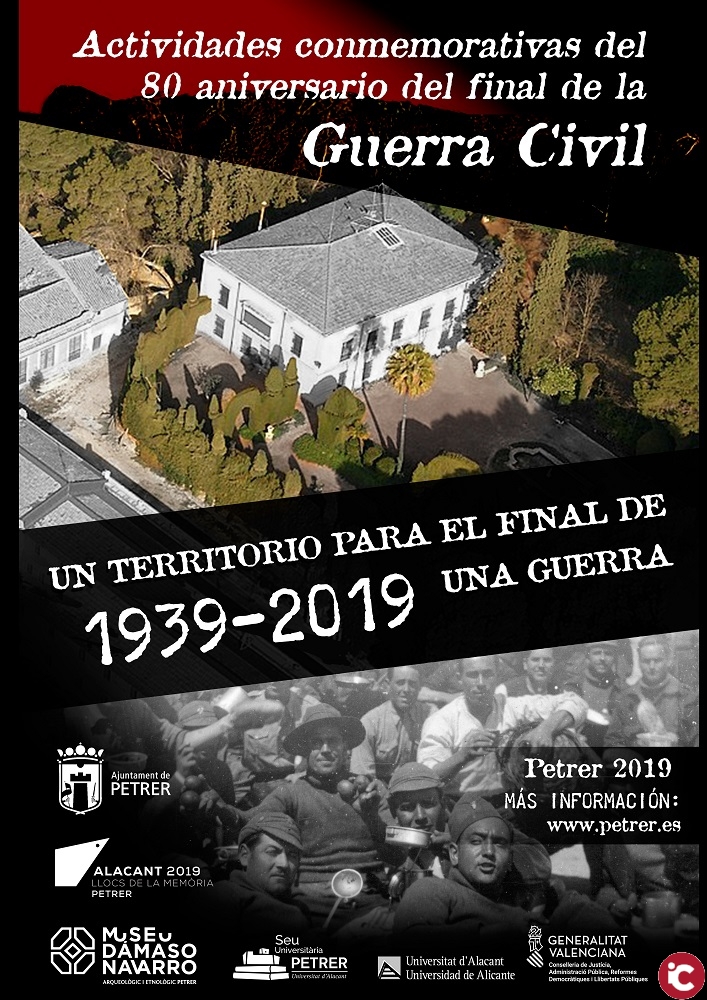 «Un territorio para el final de una guerra, 1939-2019» ha sido el nombre escogido para el cartel que engloba el conjunto de actividades que se desarrollarán en los próximos meses para conmemorar el 80 aniversario del final de la guerra civil española. El proyecto está organizado por el Ayuntamiento de Petrer y la Seu Universitaria de Petrer, con la colaboración de la Generalitat Valenciana.