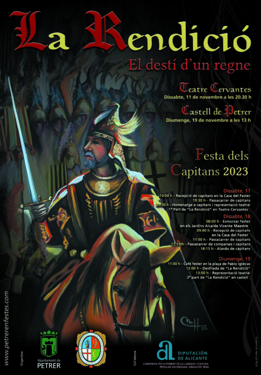 Este sábado 11 de noviembre, por la tarde, tendrá lugar el acto de homenaje a capitanes y la representación de la primera parte de La Rendició en el Teatro Cervantes, acto para el que se precisa invitación. Este año ha sido el joven actor y director petrerí José Luis Beltrán quien ha asumido la dirección de esta representación teatral que cuenta con un elenco de 24 actores y actrices, además de la colaboración del ballet del Estudio de danza de Dori Andreu.
