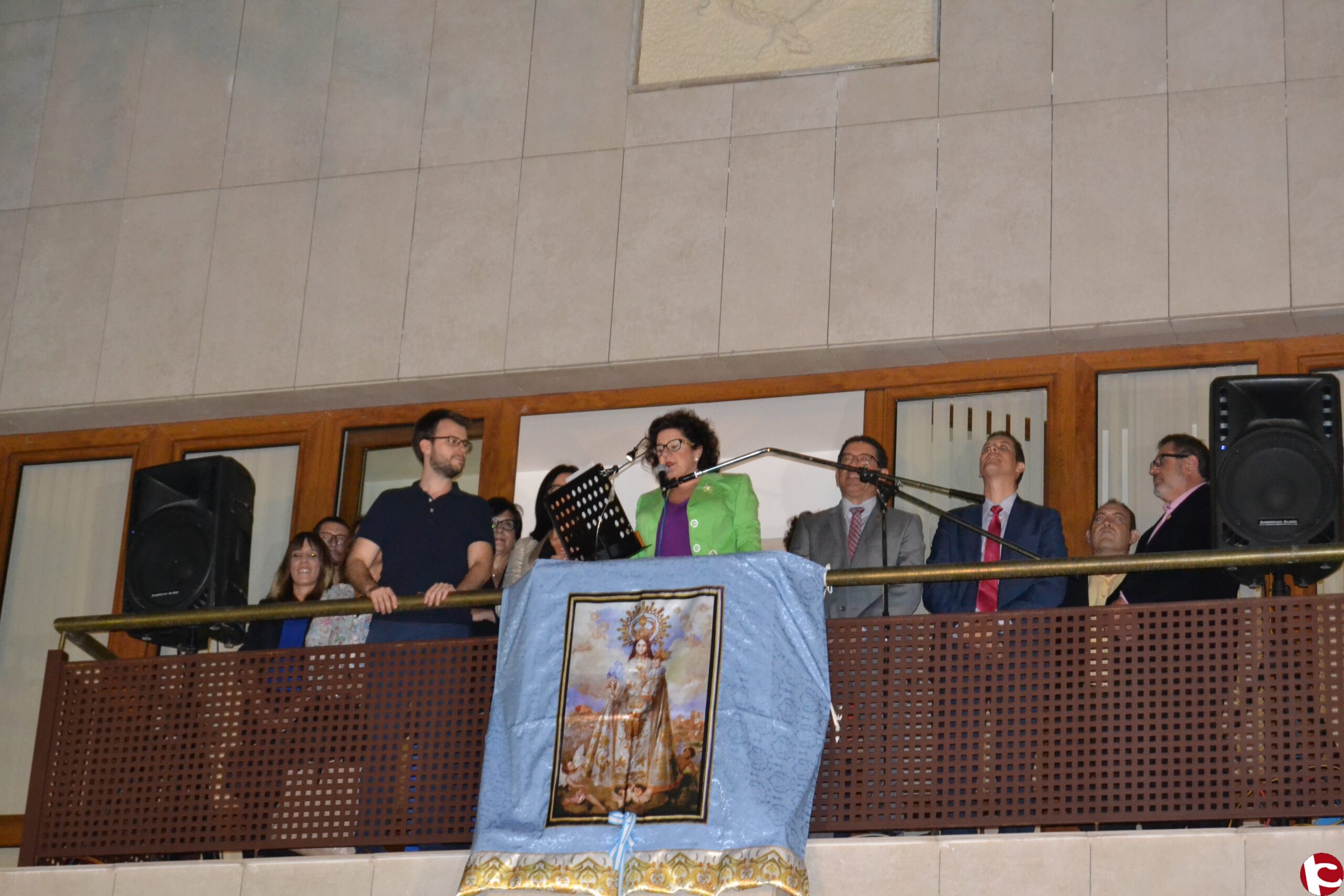 Eran las once y media de la noche, cuando Mª Carmen Rico salía al balcón del Ayuntamiento acompañada por la primera autoridad municipal, Alfonso Lacasa, y la concejala de Fiestas, Irene Navarro, por diferentes concejales de la Corporación Municipal, así como el alcalde de Elda, Rubén Alfaro, y por el senador y el diputado provincial de Ciudadanos, Luis Crisol y Fernando Sepulcre, respectivamente.