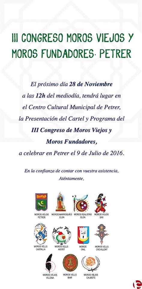 El pasado fin de semana se llevó a cabo en el Centro Cultural Municipal de Petrer, la Presentación del Cartel y Programa del III Congreso de Moros Viejos y Moros Fundadores, a celebrar en Petrer el 9 de Julio de 2016.