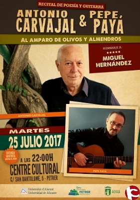 La Sede Universitaria de Petrer clausura los cursos de verano con el recital homenaje a Miguel Hernández Al amparo de olivos y almendros, un espectáculo interpretado por poeta Antonio Carvajal (Premio Nacional de Poesía) y el guitarrista petrerí, Pepe Payá, con una selección de poemas de Miguel Hernández y música de Falla, Granados, Sor y Tárrega, que rinde homenaje a Miguel Hernández en el 75 aniversario. El recital tuvo lugar en el Centro Cultural de Petrer, el martes 25 de julio, a las 22:00 horas.