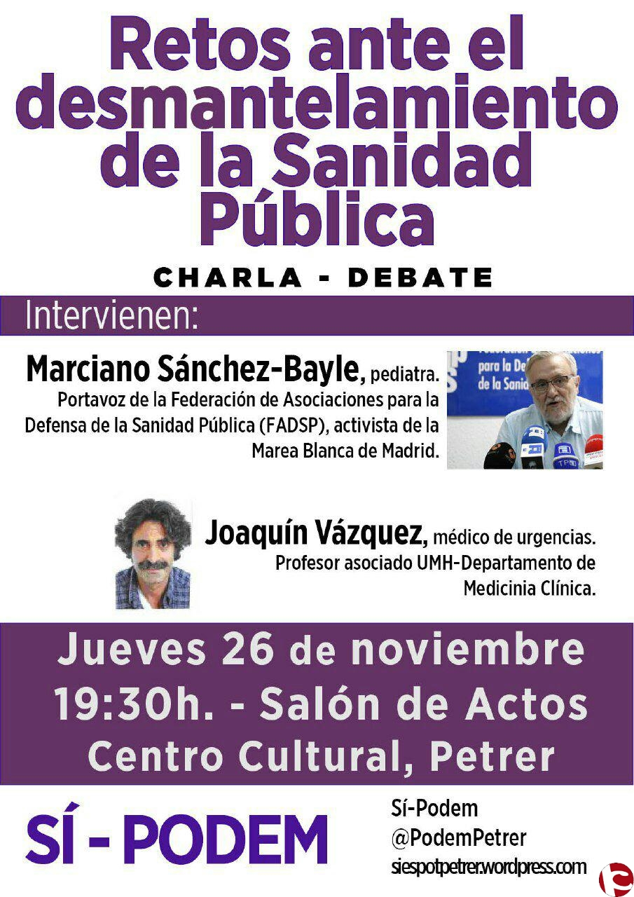 Por ultimo, desde Podemos, comprometidos como estamos con una sanidad pública, universal y de calidad, invitamos a la ciudadanía en general y en particular a todos los sectores socio-sanitarios a acudir a la charla-debate que tendrá lugar el 26 de noviembre, en el Centro Cultural (C/San Bartolomé, 6) de Petrer, a las 19:30 horas, con la presencia del Doctor Marciano Sánchez-Bayle, destacado luchador y activista por la defensa de la sanidad pública, universal y de calidad, y que sea un impulso para la creación y formación de una Plataforma en defensa de la sanidad pública en nuestras comarcas.