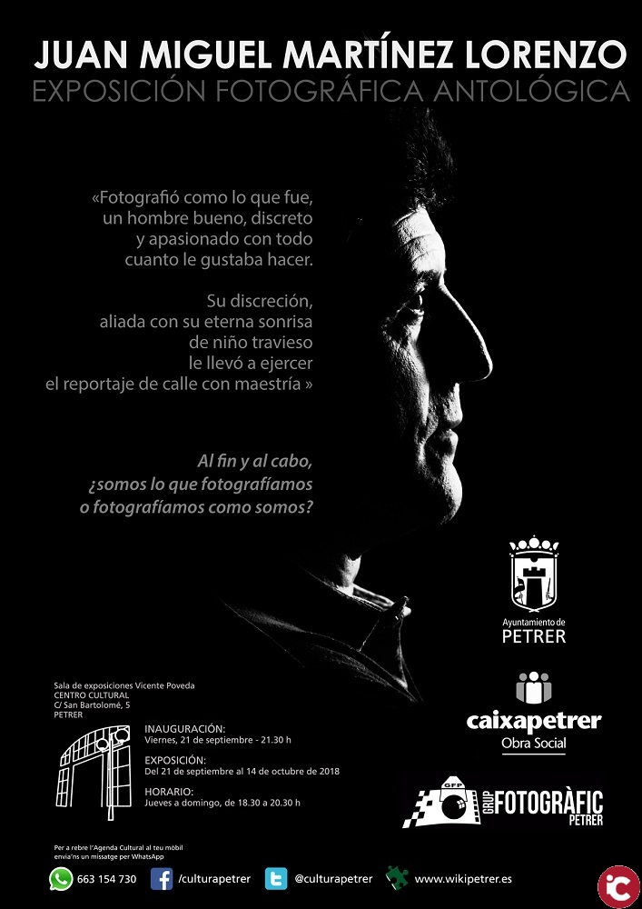 Por su parte, Fernando Portillo ha querido agradecer el esfuerzo al Grupo Fotográfico de Petrer por todo ese trabajo para la selección de fotografías que se incluyen, que, junto con la exposición y separatas de la Revista Festa, están dedicadas a Juan Miguel Martínez Lorenzo, hijo adoptivo de Petrer.