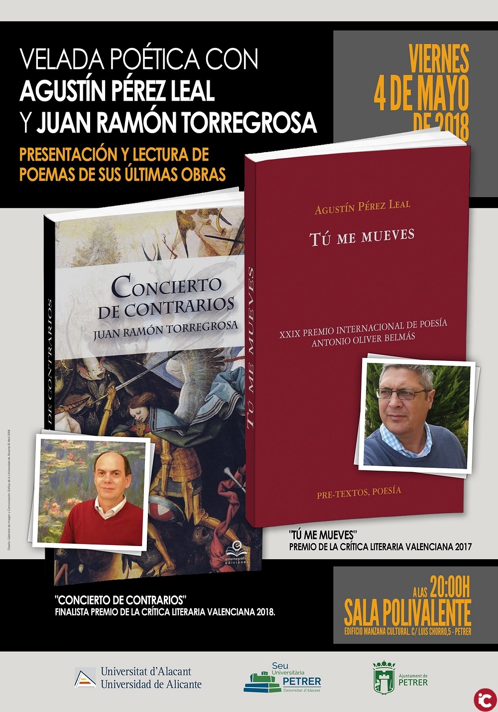 Los protagonistas presentarán y leerán algunos de sus poemas incluidos en sus últimas obras: Agustín Pérez Leal con “Tú me mueves”, libro con el que recibió el premio de la Crítica Literaria Valenciana 2017; y Juan Ramón Torregrosa con “Concierto de contrarios”, una publicación con la que ha quedado finalista de la Crítica Literaria Valenciana en su edición 2018.