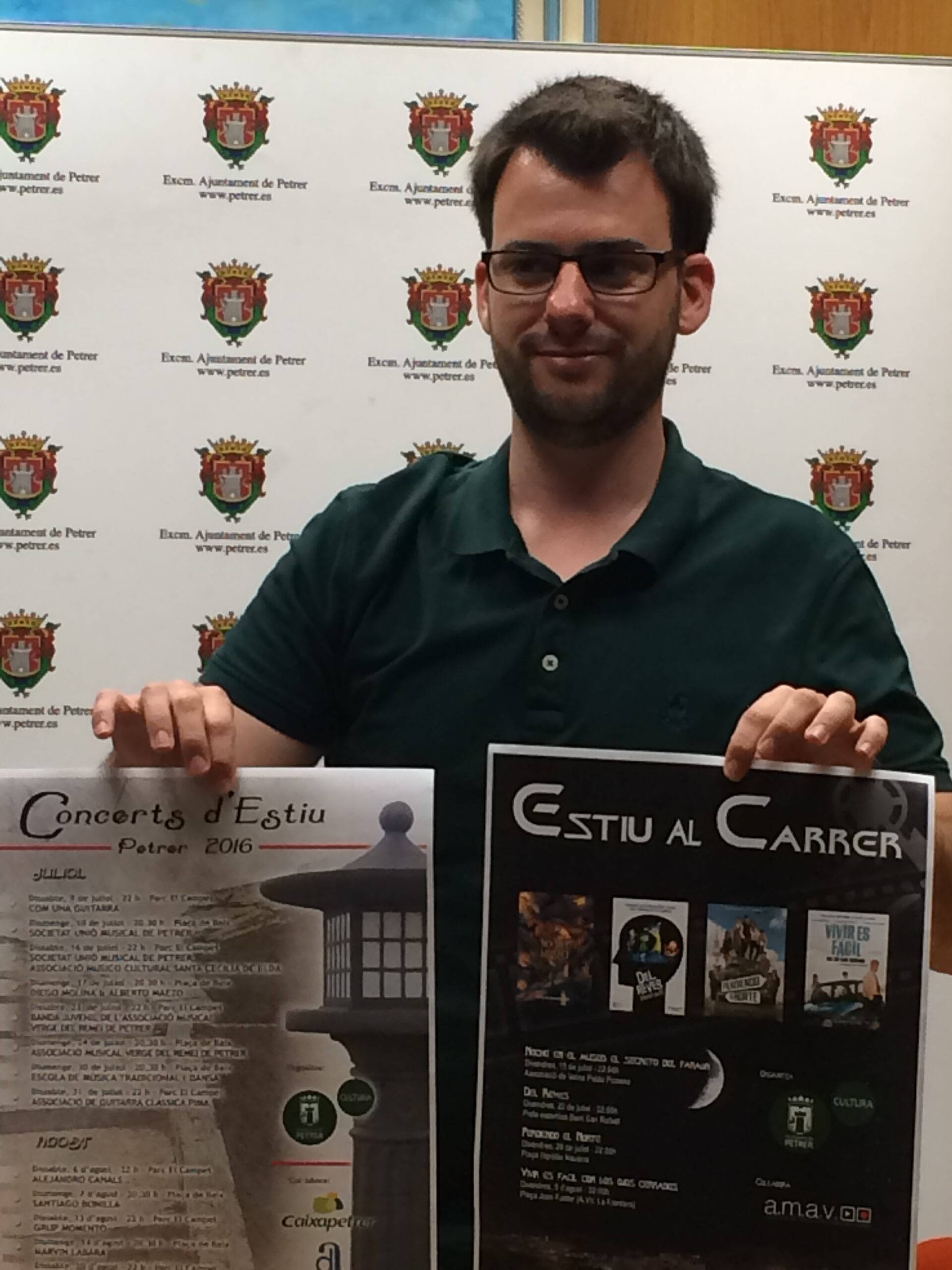 El concejal de cultura del Ayuntamiento de Petrer, Fernando Portillo, presentó ayer la programación de los actos enmarcados en Concerts d´estiu, que como es tradicional se ofrecen en el Parque El Campet y en la Plaça de Dalt, desde este viernes 9 de Julio hasta el 28 de Agosto. Participarán las sociedades, asociaciones musicales y de danza de la localidad así como varios solistas. Este año como complemento a esta actividad se inicia Estiu al Carrer, cine de verano en distintos puntos de la localidad.