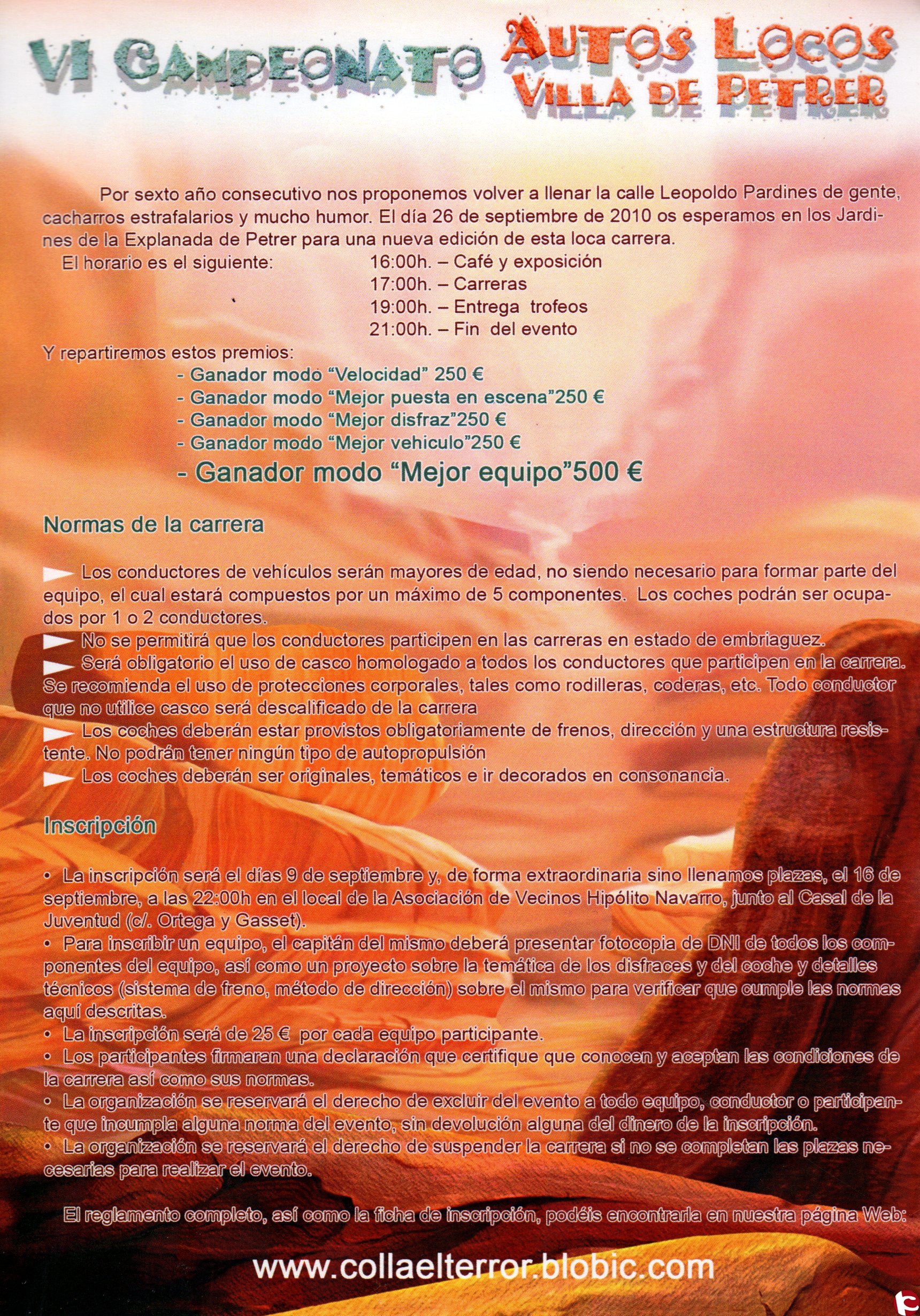 La colla «El Terror» organiza por sexto año consecutivo el Campeonato de «Autos Locos» Villa de Petrer, que se celebrará el 25 de septiembre en la zona de la Explanada. En este campeonato pueden participar equipos de cualquier punto de la provincia, con un máximo de cinco participantes y con un vehículo sin propulsión mecánica construido para la ocasión. Hay cinco premios, cuatro de ellos de 250 y el premio al mejor equipo dotado con 500. Les ofrecemos la entrevista mantenida con Constantino García, componente de la organización.