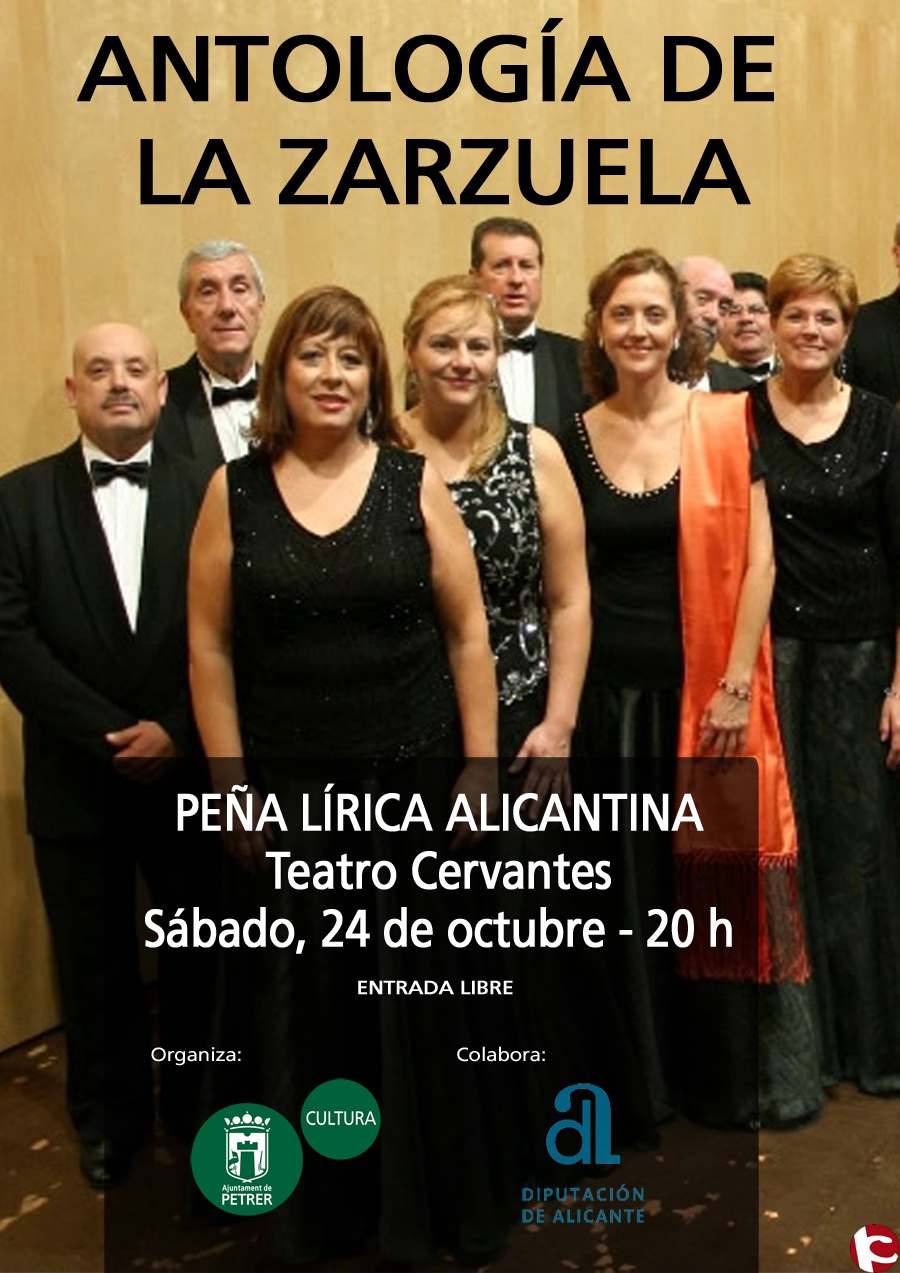 La misma tarde del sábado en el Teatro Cervantes a las 20h con entrada libre los vecinos de Petrer podrán asistir a la Antología de Zarzuela de la Peña Lírica Alicantina, una representación teatralizada de romances y canciones de zarzuela, con el acompañamiento de piano por parte del maestro y director Saúl Martínez y que contará con la actuación de la Soprano petrerina Mari Carmen Yelo.