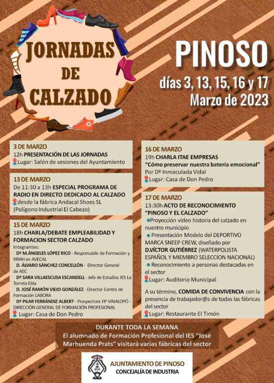 Las jornadas arrancarán el 13 de marzo con un programa “Especial Calzado” en Radio Pinoso que se emitirá en directo desde la fábrica Andacal Shoes SL, en el Polígono Industrial “El Cabezo”.