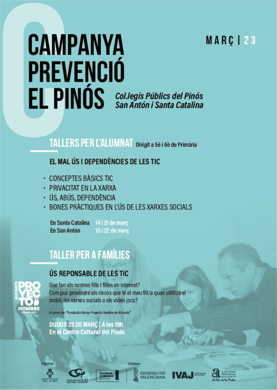 Enguany s’incrementen les activitats a un grup més ample de destinataris. De fet, s’han programat uns tallers sobre el mal ús i dependències de les TIC (Tecnologies de la Informació i la Comunicació), que es portarà a terme en els col•legis públics del Pinós, San Antón i Santa Catalina, dirigits a 5-e i 6-e de Primària. En ells es parlarà de conceptes bàsics TIC, la privacitat de la xarxa, l’ús, abús i dependència i les bones pràctiques en l’ús de les xarxes socials. En Santa Catalina serà els dies 14 i 21 de març, mentre que en San Antón serà els dies 15 i 22 de març.