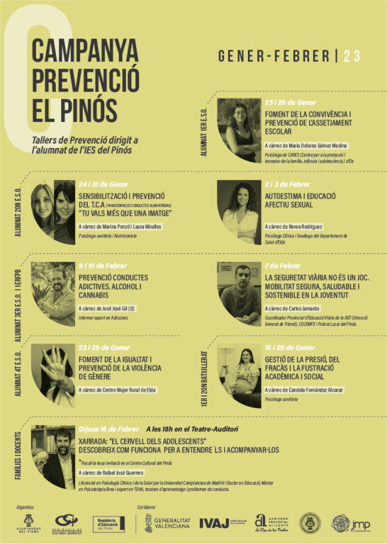 L’alumnat de 3r d’ESO i 1r de FPB assistirà a dos tallers. El primer serà els dies 9 i 10 de febrer i tractarà el tema ‘Prevenció de Conductes Addictives. Alcohol i Cannabis’, que oferirà José José Gil (JJ), infermer expert en addiccions. I el 7 de febrer, Carlos Jamardo, coordinador provincial d’Educació Viària de la DGT, oferirà novament el taller ‘La Seguretat Viària no és un joc. Mobilitat segura, saludable i sostenible en la joventut’, activitat en la qual col•laboren COCEMFE i la Policia Local del Pinós.