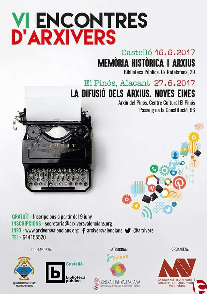 Lunes, 26 de junio de 2017. Pinoso acogerá mañana, por primera vez, el VI Encontre d’Archivers organizado por l’Associació d’Arxivers i Gestors de Documents Valencians (AAV), con la colaboración del Ayuntamiento de Pinoso, con motivo del Día Internacional de los Archivos celebrado el pasado 9 de junio. Con el lema Archivos, Ciudadanía e Interculturalismo, la AAV llevó a cabo una primera actividad centrada en la Memoria Histórica, en Castellón a mediados de mes, mientras que en Pinoso el encuentro versará sobre las nuevas herramientas existentes para difundir los archivos.