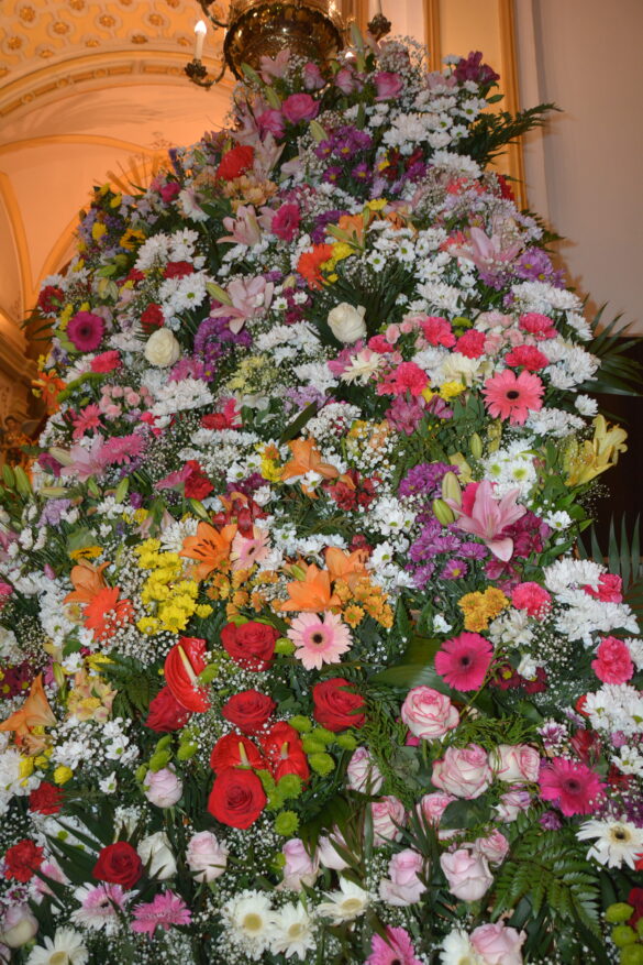 Una vez que las personas que han participado en la ofrenda accedían al interior del templo parroquial, a los pies del altar mayor, les esperaban miembros de la directiva de la Cofradía de la Virgen del Remedio que se han encargado de recepcionar los ramos de flores, que han sido colocados en ambos paneles laterales, formando un gran mosaico.
