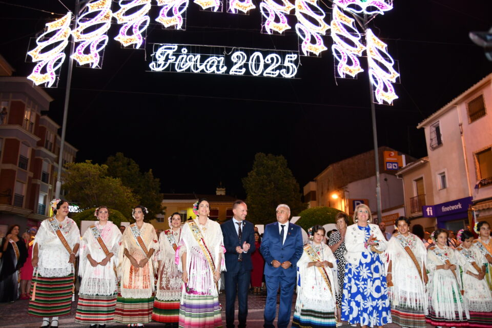 Con el escenario del parking municipal listo, las Cortes de Honor Infantil y Mayor hacían su entrada, seguidas por el pregonero, Juanito López Ruiz, quien accedió al estrado acompañado por Elisa Santiago y Lázaro Azorín. Antes de escuchar al pregonero el alclade y la edil de Fiestas han entregado a las Reinas Infantil y Mayor de este año, Cristina Benavente Vigueras y Andrea Belda Martínez, junto a sus cortes de honor sus retratos oficiales, sellando así el inicio de su reinado.