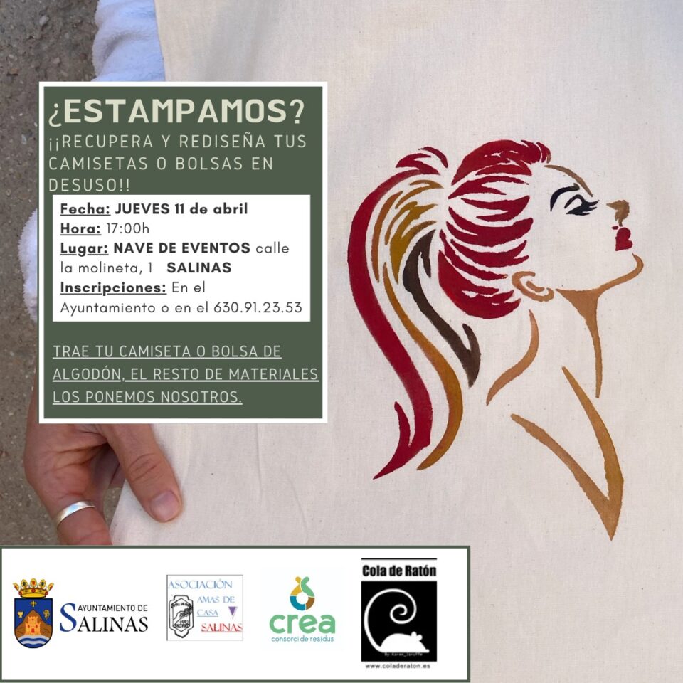 Desde el Ayuntamiento de Salinas, animan a toda la población a apuntarse al taller de estampado que realiza Cola de Ratón Design y organiza el Consorcio de Residuos Crea y a pasar un buen rato mientras creas tus propios diseños.