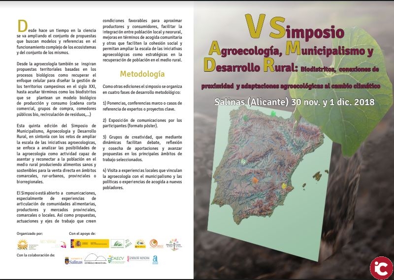 Los próximos días 30 de noviembre y 1 de diciembre, en Salinas, Alicante, tendrá lugar el V Simposio de Agroecología, Municipalismo y Desarrollo Rural. Una propuesta llena de experiencias e ideas innovadoras en el marco de la agroecología que se realizará en el Auditorio Municipal. Las inscripciones a dicho evento pueden realizarse de forma online en: www.agroecologia.net/formulario-simposio-salinas18 y tiene un coste de 30 euros que incluye documentación, comida, certificados y acceso virtual a las presentaciones.